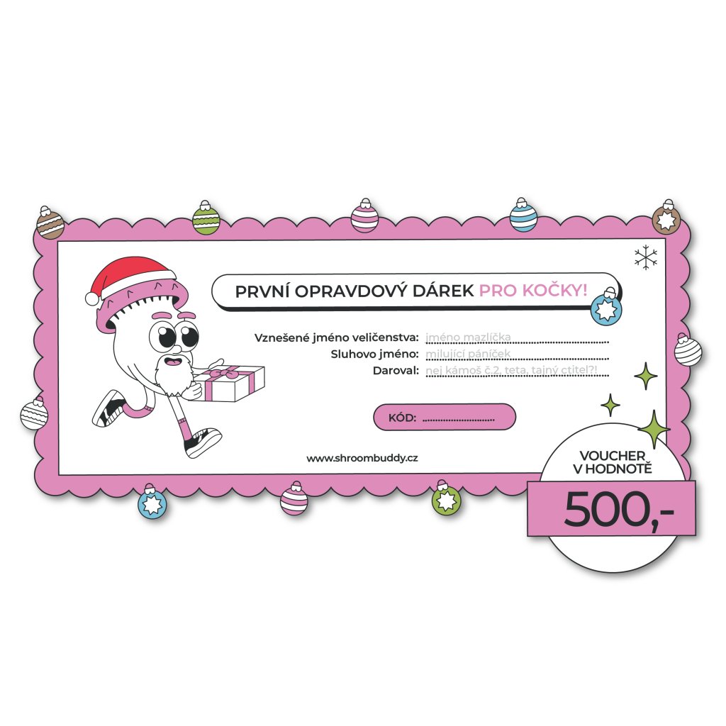 Voucher lze uplatnit na všechny produkty Shroom Buddy z kategorie KOČKY – od ikonického Shroomboxu Cats, přes kapky do uší, balzám na tlapky až po kapky pro svěží dech.